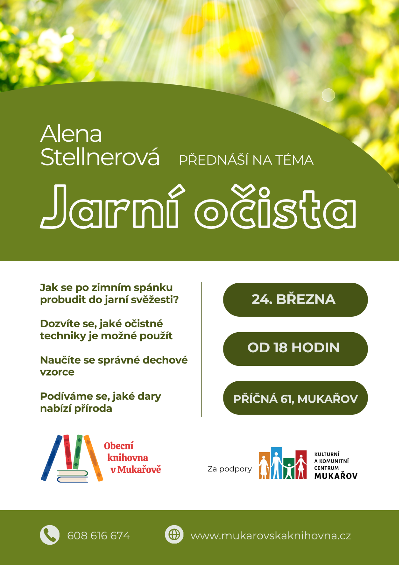 V úterý 24. 3. 2026 srdečně zveme na přednášku s Alenou Stellnerovou na téma: Jarní očista.